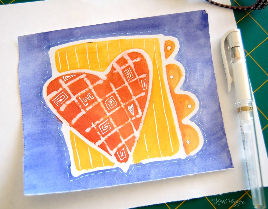 waxmelter yesterday.....ooooh, it's fun, and really easy to use! i decided to do a little experimenting using different types of paper. this heart doodle was "drawn" onto white cardstock using the waxmelter.....i used beeswax and it hardens on the paper fairly quickly. just as with batik, i painted in the open areas with watercolor, let it dry, and then placed paper towels over the paper and put a hot iron on top to melt the wax. the paper towels absorb the melted wax, while some of it bleeds out into the paper......